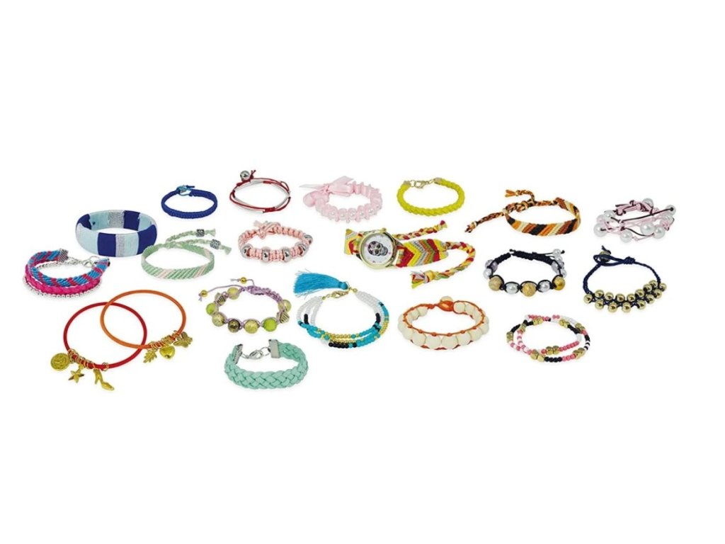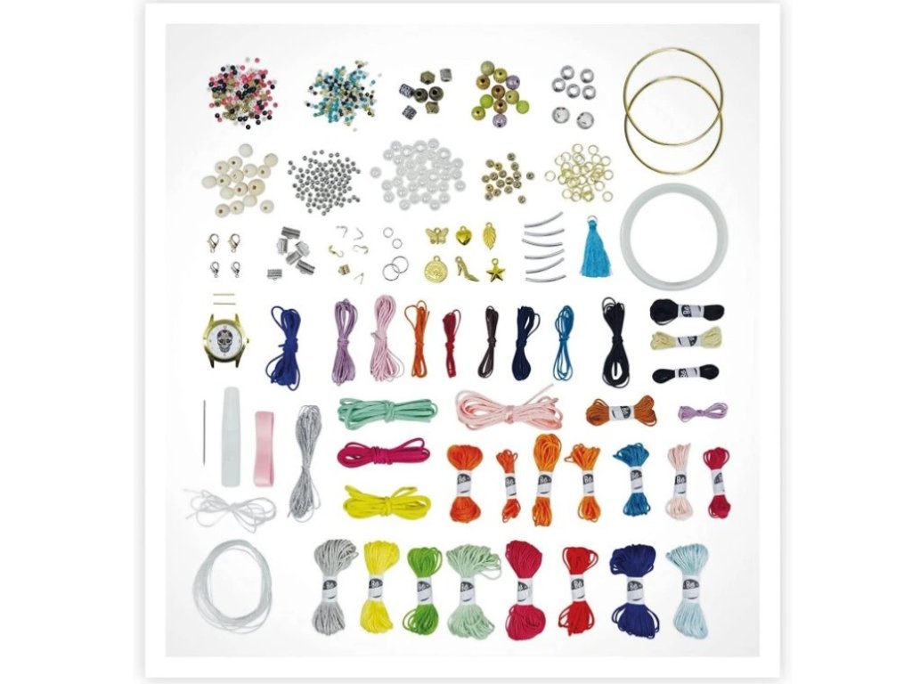 Sada MEGA náramky obsahuje mnoho druhov bižetérie, korálikov, šnúrok a vlákien na výrobu 20tich nádherných náramkov vrátane jedného so štýlovými funkčnými hodinkami .