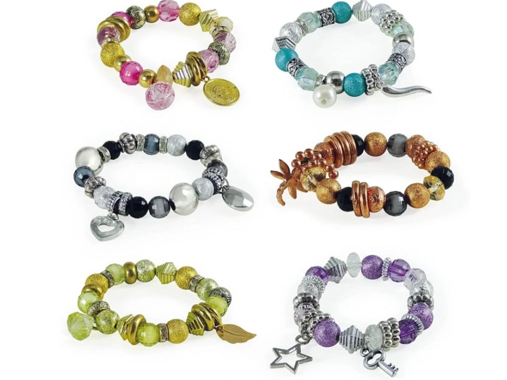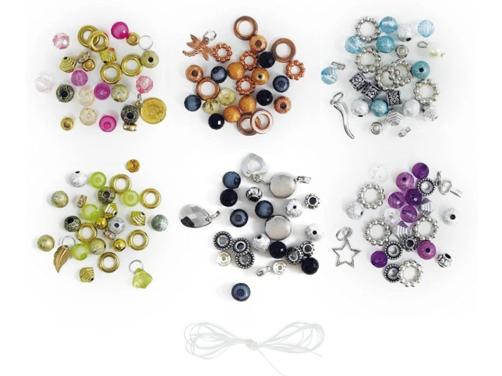 Sada Očarujúce náramky obsahuje postup a príslušenstvo na výrobu 6 náramkov (náramky rôznych druhov a farieb, a prívesky).