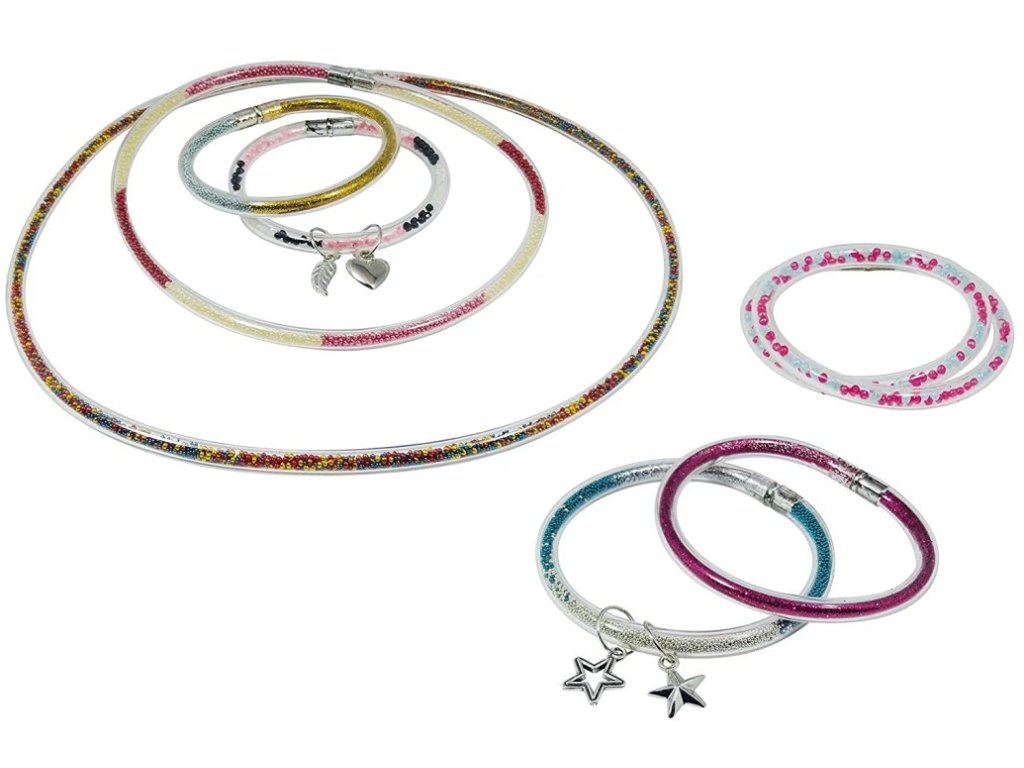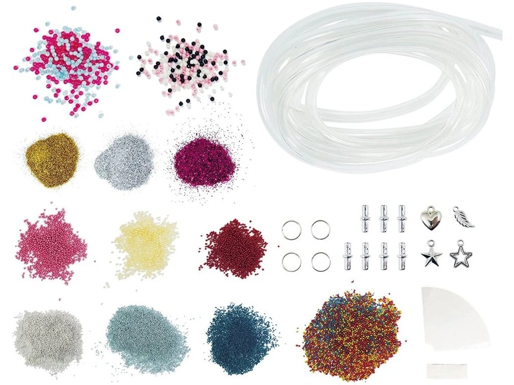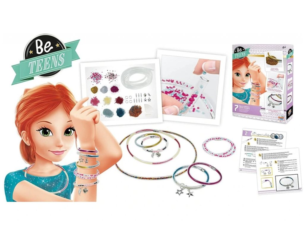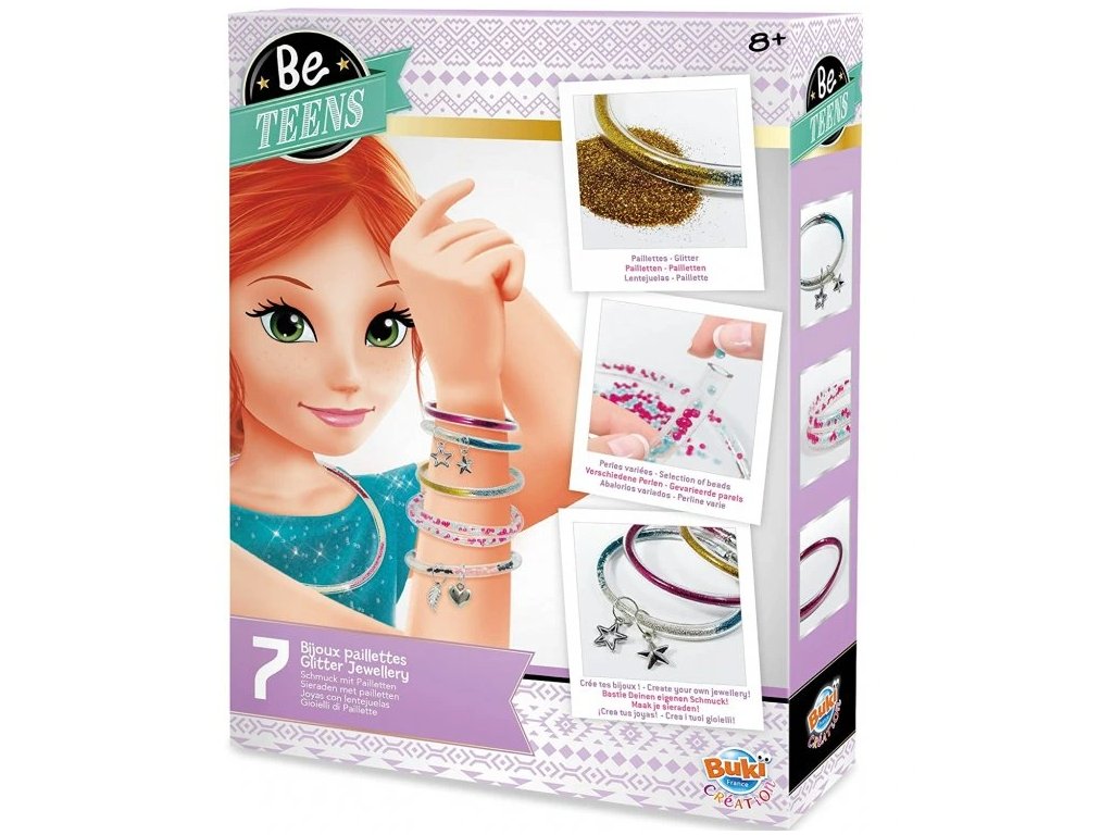 Sady BeTeens sú určené pre kreatívne dievčatá, ktoré chcú byť originálne a vlastné šperky si samy vyrobiť/vytvoriť. Súprava Trblietavé šperky obsahuje postup a príslušenstvo na výrobu 7 šperkov (náramky a náhrdelníky s rôznymi trblietavými motívmi a príveskami).