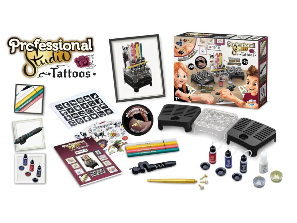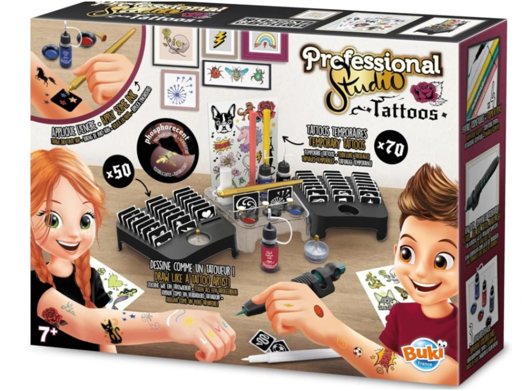 Premeňte sny o kreatívnych tetovaniach na skutočnosť s Tetovacím štúdiom od Buki! Tento set je špeciálne navrhnutý pre deti od 7 rokov, ktoré si chcú vyskúšať bezpečné a dočasné tetovanie s rôznymi farebnými efektmi. Sada obsahuje všetko potrebné na vytvorenie úžasných dizajnov na pokožke, vrátane šablón, atramentov, trblietok a dočasných tetovačiek.