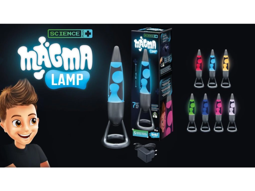- Skutočný „magma“ efekt — farebné kvapôčky a bubliny plynú v priehľadnej nádobe a imitujú prúdenie lávy.