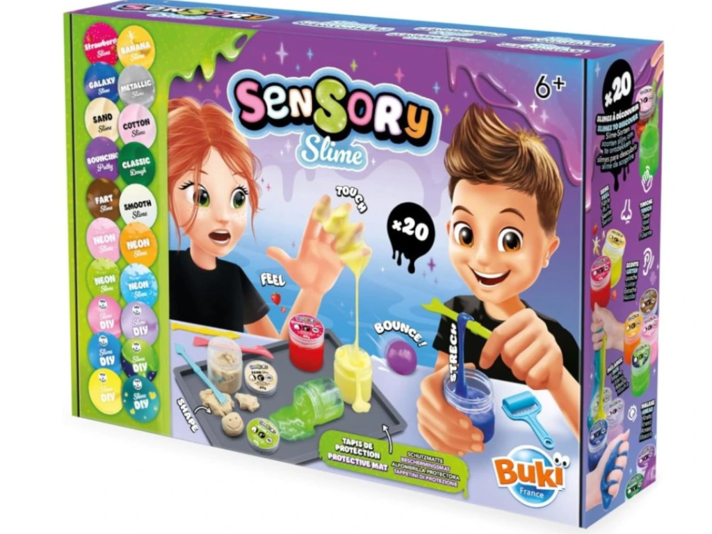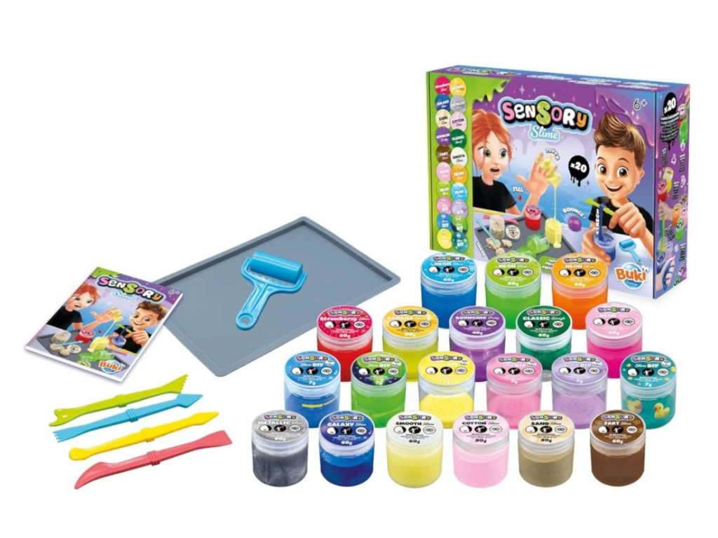 Objavte svet zábavných a jedinečných textúr s BUKI - Sensorický Sliz! Táto súprava umožňuje vytvoriť a objaviť až 20 rôznych druhov slizov – od skákacieho a svietiaceho slizu až po neónový, bavlnený, metalický či galaktický. Ide o relaxačnú a zmyslovú hračku, ktorá je ideálna pre deti od 6 rokov.