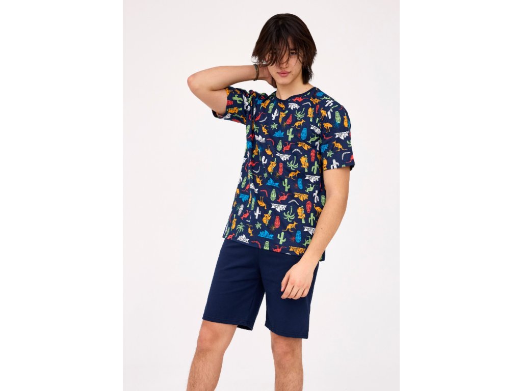 Chlapčenské pyžamo Cornette Australia . Chlapčenské pyžamo s krátkym rukávom a šortkami. Tričko s okrúhlym výstrihom, mladistvý vzor. Jednofarebné šortky sú v páse do gumy. Veľmi príjemný materiál a nápaditý design.