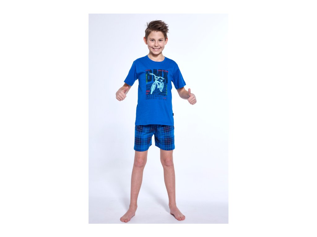 Chlapčenské pyžamo Cornette BMX. Chlapčenské pyžamo s krátkym rukávom a šortkami. Tričko s okrúhlym výstrihom má na prednom diele mladistvú potlač. Šortky sú v páse do gumy. Veľmi príjemný materiál a nápaditý design. Balené v krabičke