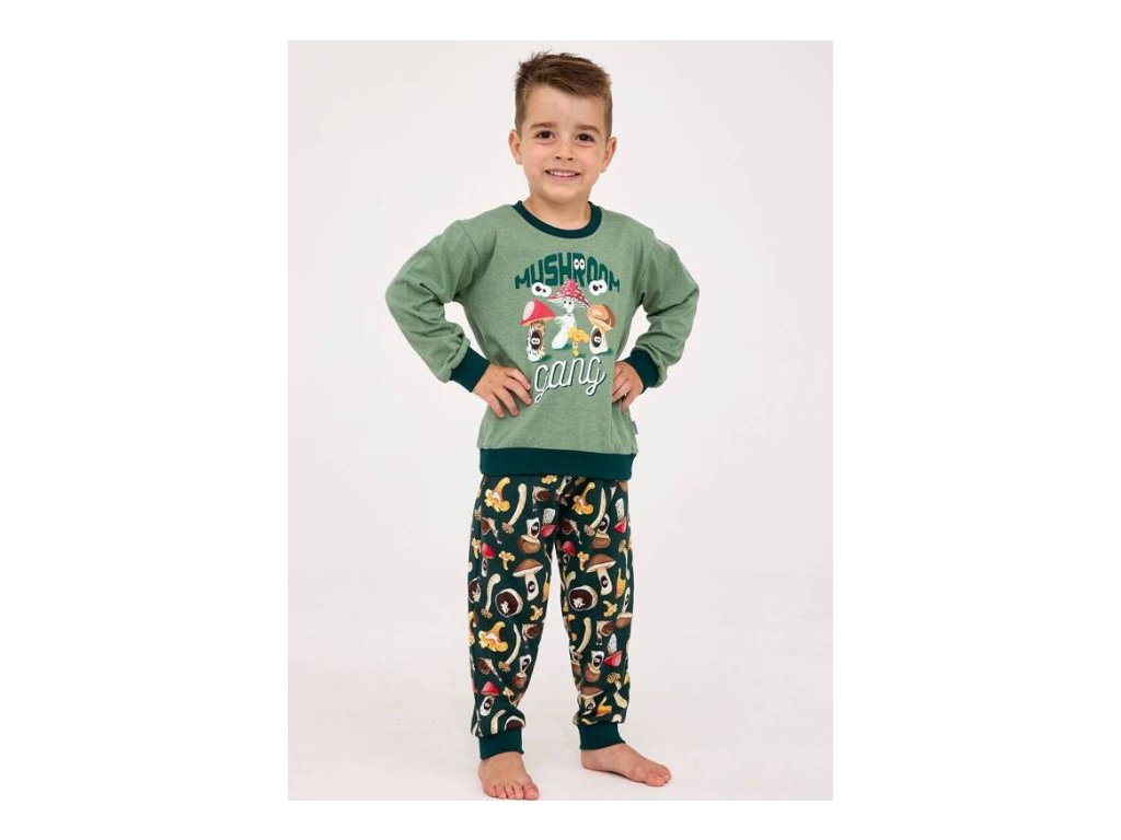 chlapčenské pyžamo s dlhým rukávom a dlhými nohavicami, všívaná široká guma v páse nohavíc. Spodná časť vrchného dielu, rukávov i nohavíc je ukončená pružným patentom. Fosforujúca potlač.