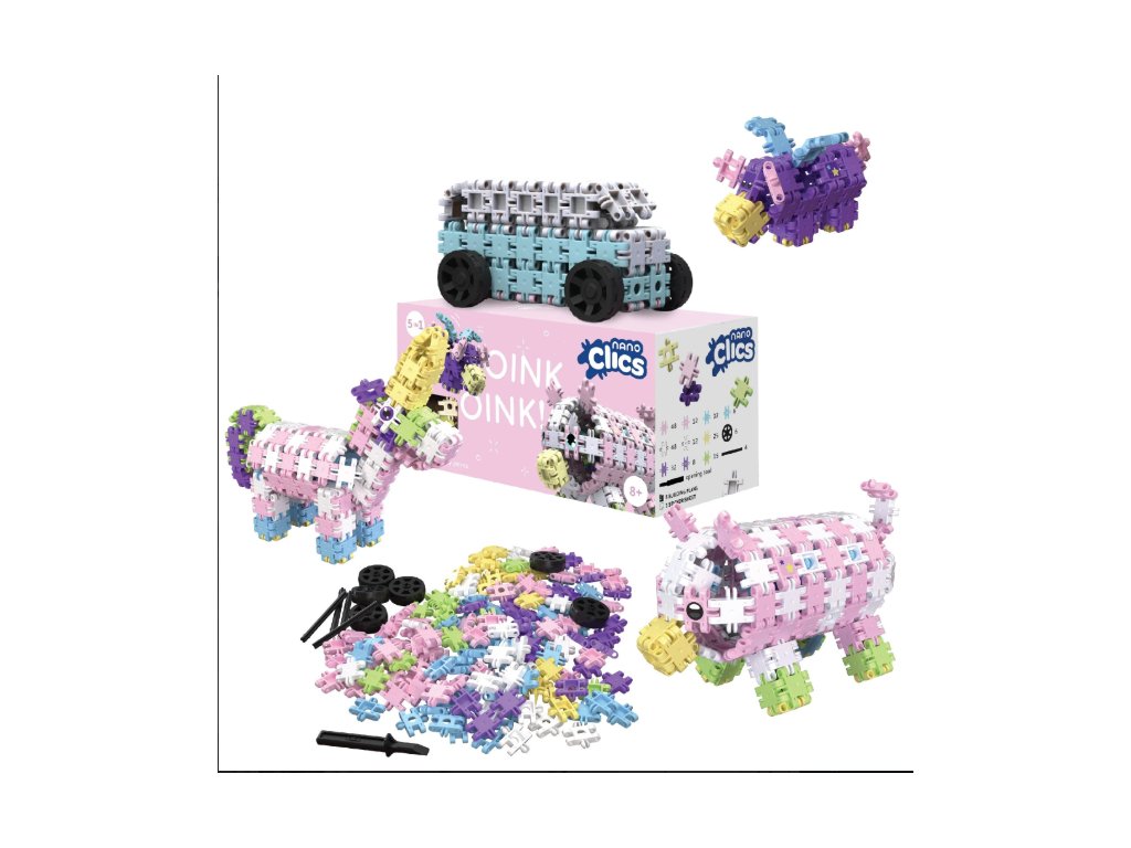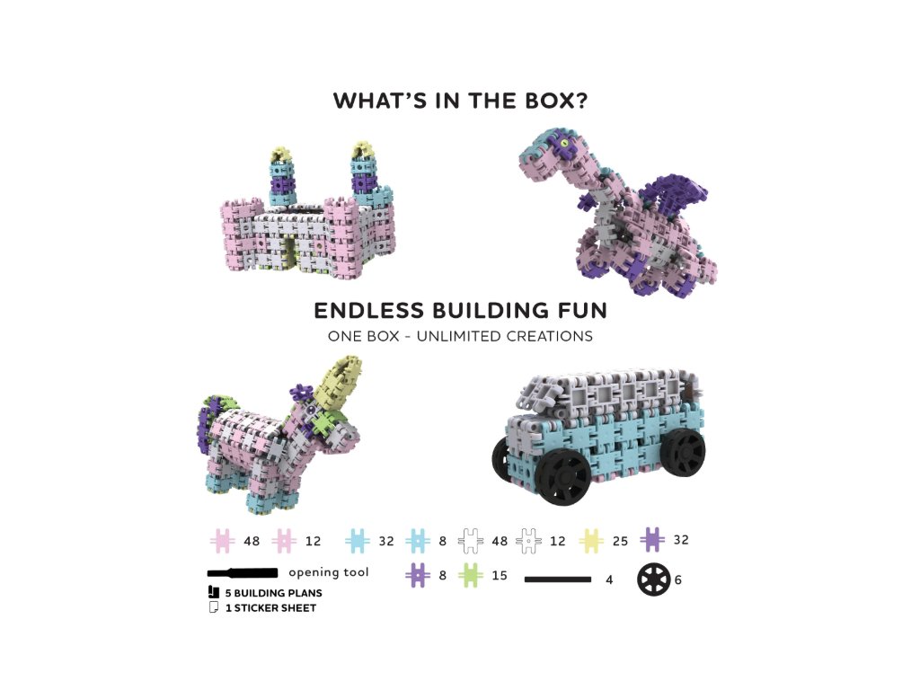 Ekologická stavebnica Nano Clics Fantázia je skvelou voľbou pre všetkých malých staviteľov. Táto 250-dielna farebná stavebnica ponúka všetko, čo dieťa potrebuje na vytvorenie rôznych úžasných výtvorov, ako je jednorožec, hrad, drak či roztomillé prasiatko. Dieliky sú menšie, čo umožňuje vytvárať detailnejšie 2D a 3D stavby. Súčasťou balenia je aj hárok nálepiek a podrobné stavebné plány, ktoré pomôžu deťom postaviť minimálne 5 realistických figúrok. Vďaka novému dizajnu blokov s otvorom v strede je možné vytvoriť ešte prepracovanejšie stavby a deti si užijú hodiny plné kreatívnej zábavy.