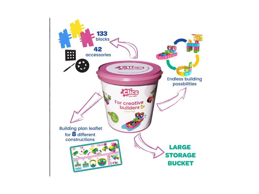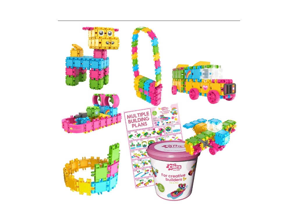 Konštrukčná stavebnica Clics 175 ks rozvíja jemnú motoriku, koordináciu ruka-oko aj kreativitu a podporuje hru s otvoreným koncom. Jedná sa o jedinečnú STEM montessori hračku. Je pevná a umývateľná. Stavebnica Clics sa vyrába v Belgicku z recyklovaného plastu, rovnako ako všetok použitý plastový obalový materiál. Značka Clics Toys tak redukuje svoju karbónovú stopu až o 90%. Stavebnica Clics je vhodná pre deti od 4 rokov a je skvelá ako originálny darček pre deti k narodeninám aj Vianociam.