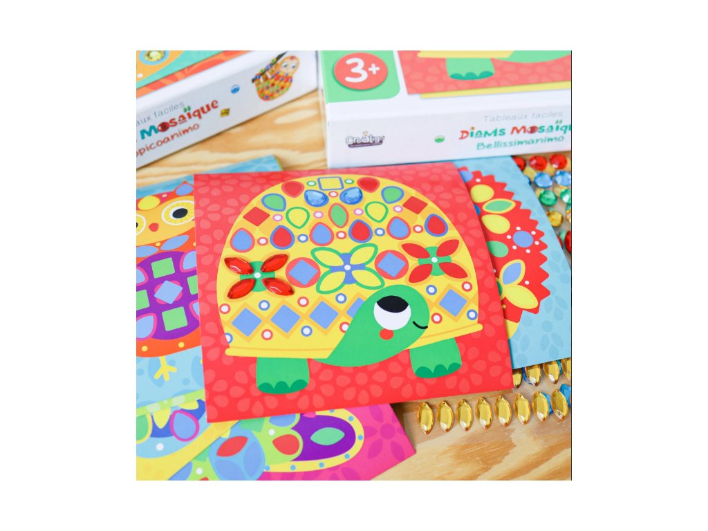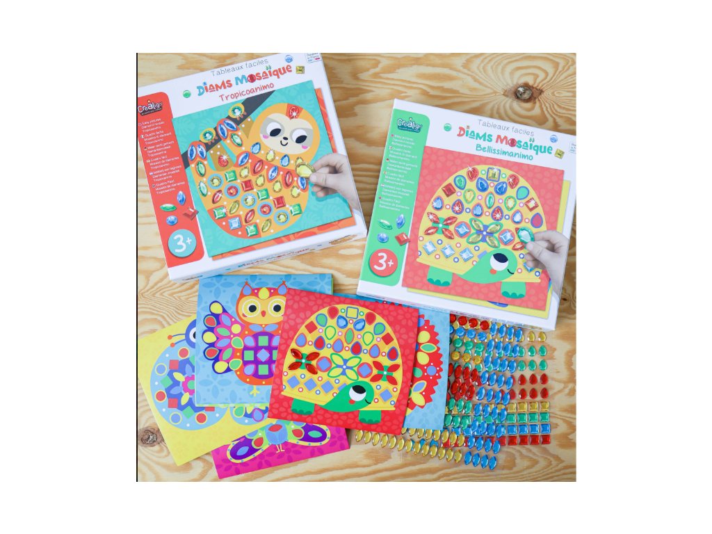 Nalepovacia diamantová mozaika Zvieratká je úžasná kreatívna sada od francúzskej značky Crea Lign z radu Jednoduché obrázky vhodné už pre deti od 3 rokov. Obsahuje 6 obrázkov zvieratiek a 281 diamantových nálepiek. Vďaka nim si deti farebné zvieratká krásne vyzdobia. Nechýba ani 1 stojan na následné vystavenie obrázkov.