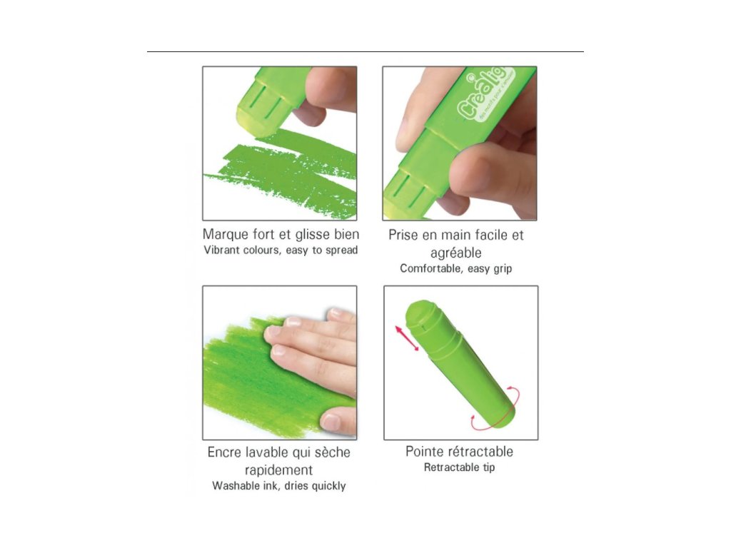 Jumbo voskovky od francúzskej značky Crea Lign potešia deti sýtymi farbami a jednoduchým úchopom. Voskovky sú vyrobené z kvasových farieb, nie sú preto mastné, rýchlo schnú a zanechávajú hrubú a výraznú stopu. Každá voskovka je ukrytá vo vlastnom vysúvacom púzdre, takže sa deťom hneď tak nezlomí. Farby sa dajú ľahko zmyť a vyprať.