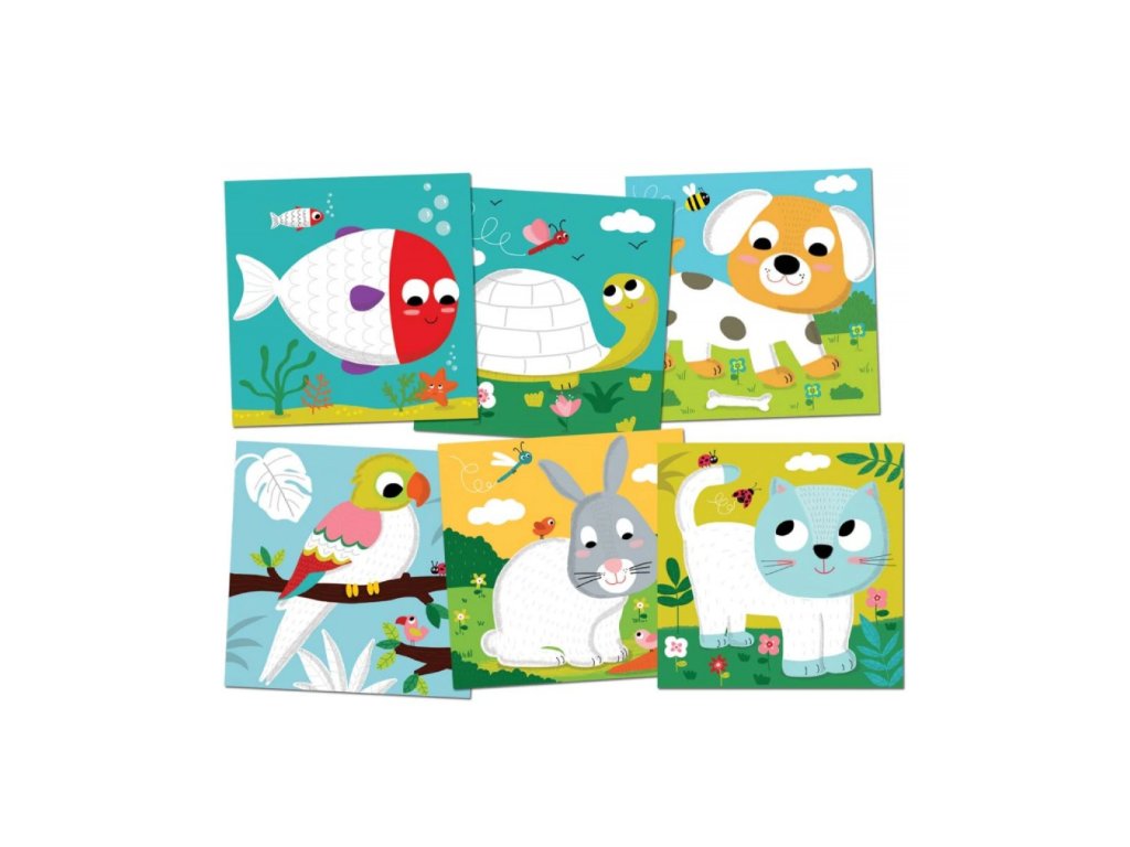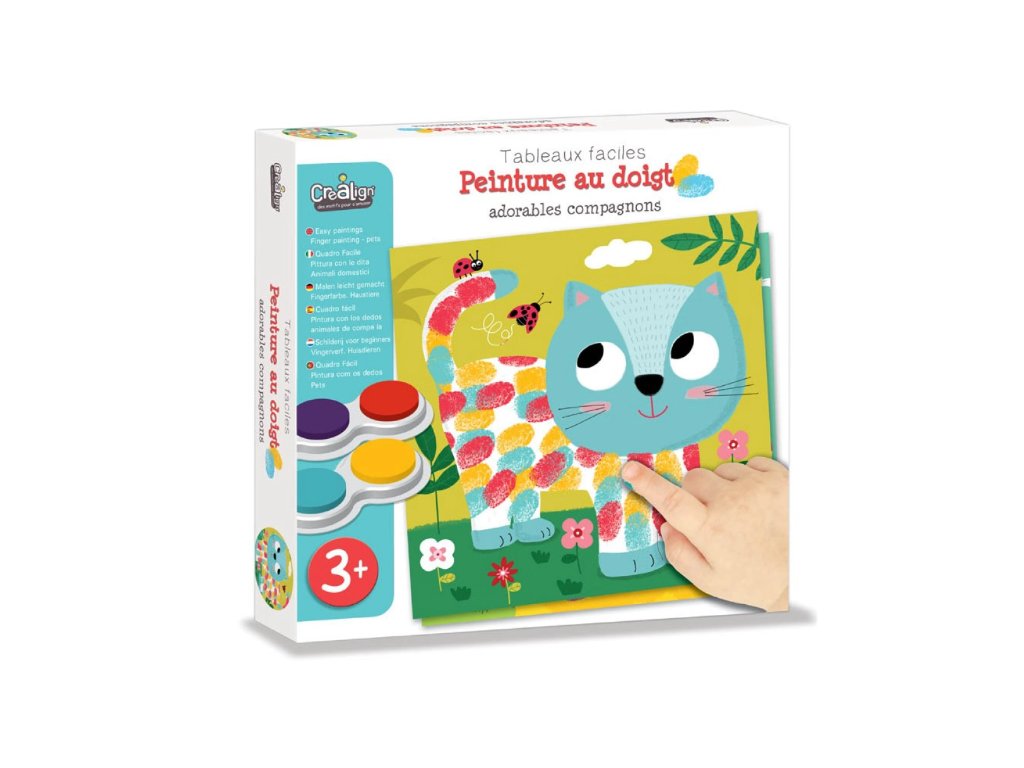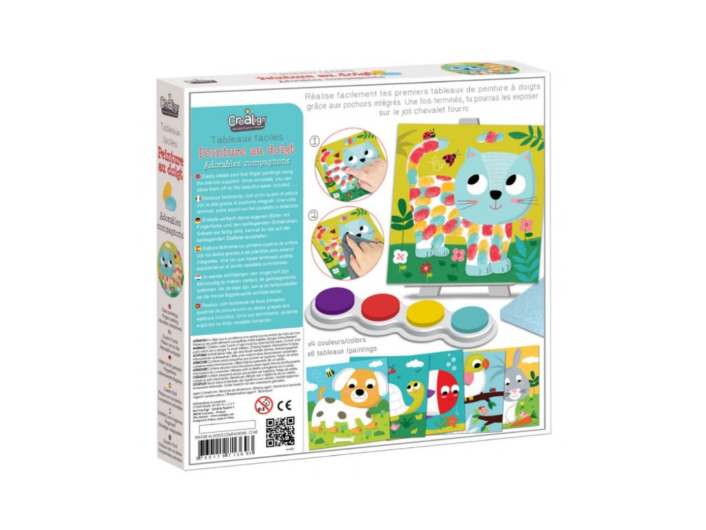 Kreatívna sada pre deti Maľovanie prstovými farbami Domáce zvieratká od francúzskej značky Crea Lign z radu Jednoduché obrázky je vhodné už pre deti od 3 rokov. Obsahuje 6 obrázkov zvieratiek na vymaľovanie a paletu so 4 farebnými poduškami na odtlačky prstov. Vďaka nim si deti rozkošné lesné zvieratká krásne vyfarbia len za pomoci svojich odtlačkov prstov. Nechýba ani 1 hubka na následné vystavenie obrázkov a 1 handrička na utieranie prstov.
