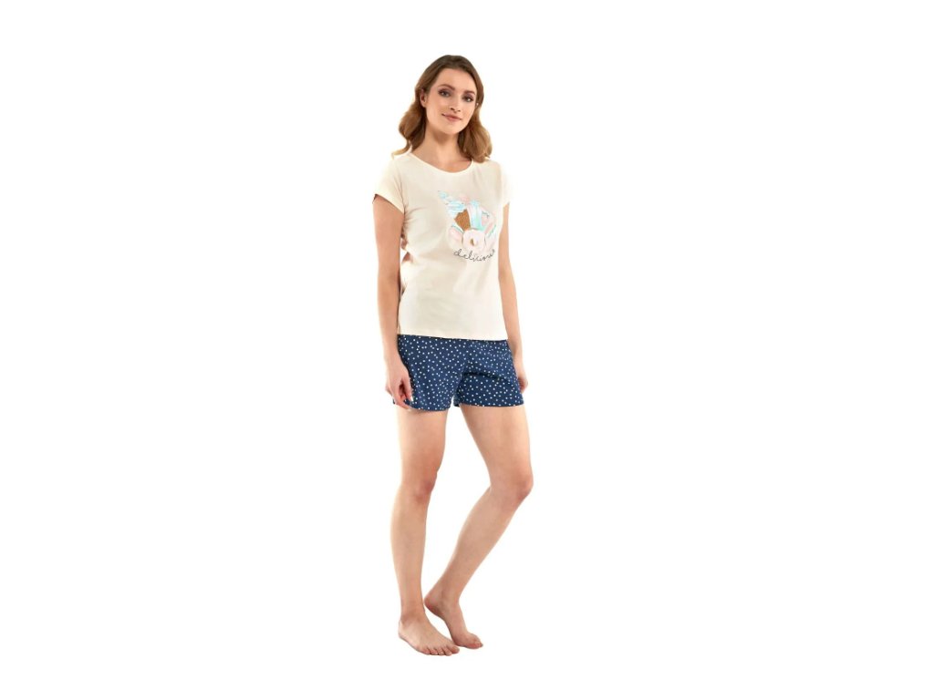 Dámske pyžamo Delicious Cornette - bavlnený materiál je pružný a jemný na dotyk - broskyňové tričko s krátkym rukávom - potlač na prednej strane - pohodlné modré šortky s bielymi bodkami - pyžamo je vhodné na každodenné nosenie. Dámske pyžamo Cornette krátky rukáv je vyrobené z vysokokvalitnej bavlny.