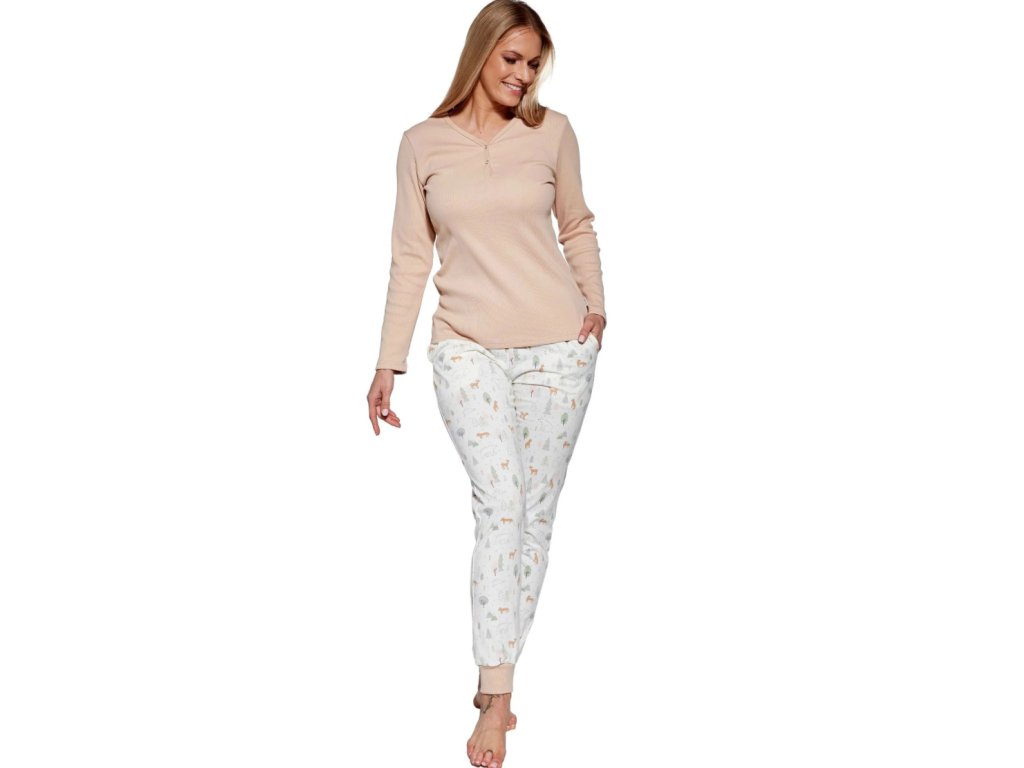 Dámske pyžamo Emy CORNETTE - bavlnený materiál je pružný a mäkký na dotyk - béžové tričko s dlhými rukávmi - zapínanie na patentky - dlhé vzorované nohavice Zloženie materiálu: 100% bavlna. Dámske pyžamo Cornette dlhý rukáv je vyrobené z vysokokvalitnej bavlny.
