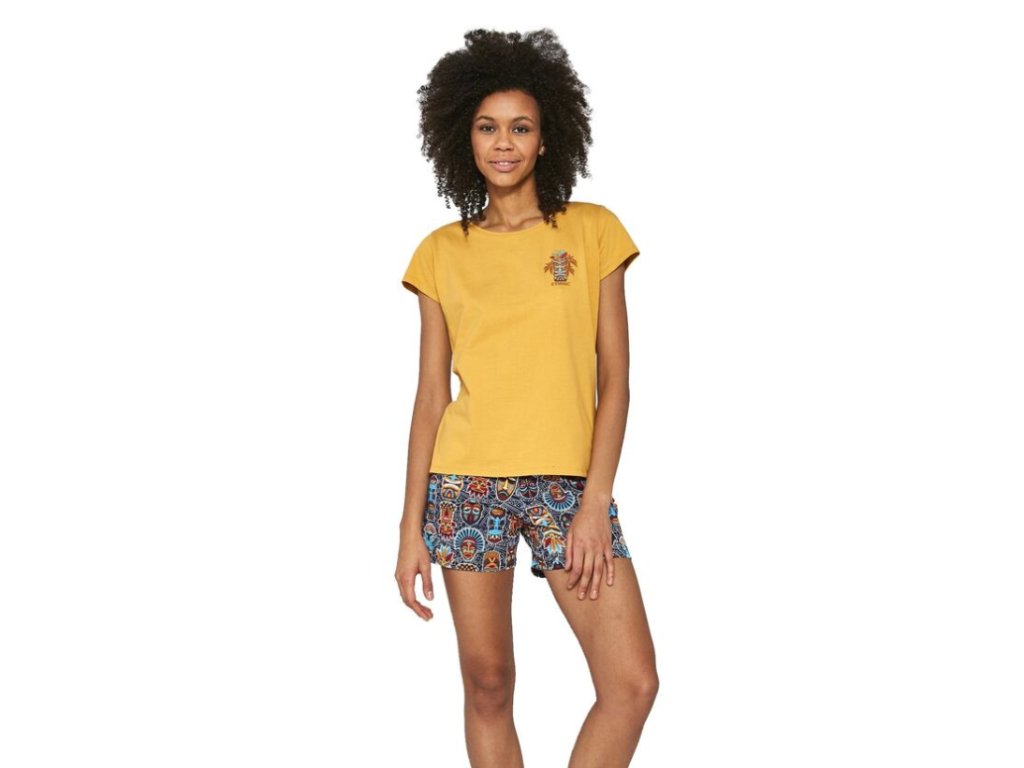 Dámske pyžamo sa skladá z trička s krátkym rukávom a krátkymi nohavicami. Pôvabné horčicovej tričko s decentnou potlačou na hrudi má klasický okrúhly výstrih. Nohavice majú na tmavomodrej podklade celopotlač s etnickými obrázkami. V páse sú do gumy. Voľnejší strih nohavíc Vám zaistí pohodlie po celú noc. Pyžamo iste možno využiť aj ako veľmi moderný a pohodlný domáci odev. Dámske pyžamo Cornette krátky rukáv je vyrobené z vysokokvalitnej bavlny.