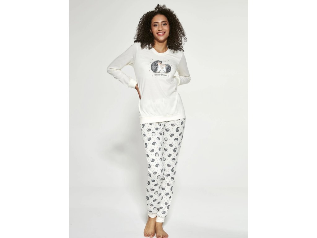 Pohodlné dámske pyžamo s elastickými manžetami. Dlhé rukávy a dlhé nohavice sú perfektným riešením na jesenné a zimné noci. Jemný ecru vrch pyžama je zdobený vtipnou potlačou ježka. Pyžamové nohavice, tiež s potlačou ježka, dodávajú pyžamu štýl. Pyžamový set je vyrobený z príjemného úpletu na dotyk, ktorý umožňuje pokožke dýchať. Dámske pyžamo Cornette dlhý rukáv je vyrobené z vysokokvalitnej bavlny.