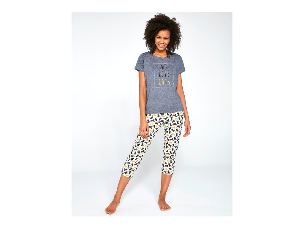 Dámske pyžamo vyrobené z vysoko kvalitnej, veľmi peknej a mäkkej bavlny. Tričko s krátkym rukávom s nápisom WE LOVE CATS. Nohavice bez rozkroku, zdobené vzorom mačiek. Balené v krabici. Zloženie: 100% bavlna. Dámske pyžamo Cornette krátky rukáv je vyrobené z vysokokvalitnej bavlny.