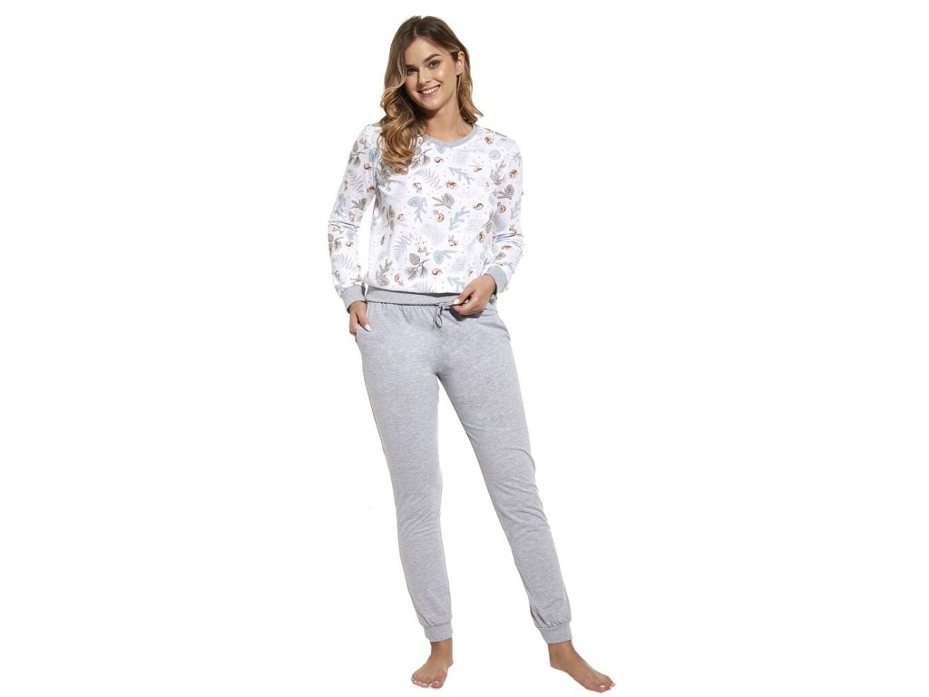 Veľmi príjemné pyžamo pre dámy s tričkom s dlhým rukávom a dlhými nohavicami. Krásne dámske pyžamo Vám prináša obľúbené Cornette. Bavlnené tričko má na bielom podklade potlač s lesnou tematikou. Dlhé rukávy aj spodný lem sú ukončené manžetou. Šedé nohavice sú majú dve postranné vrecká. V páse sú do širšej gumy. Nohavice sú zakončené do manžety. Pohodlné pyžamo na sladké.  Dámske pyžamo Cornette dlhý rukáv je vyrobené z vysokokvalitnej bavlny. sny