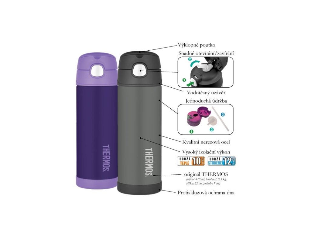 Teplé a studené nápoje sa pijú priamo z termosky - bez nalievania do hrnčeka. Nápoj sa pije pomocou slamky - nie je potrebné termosku nakláňať.