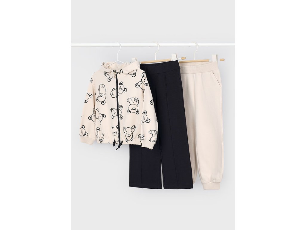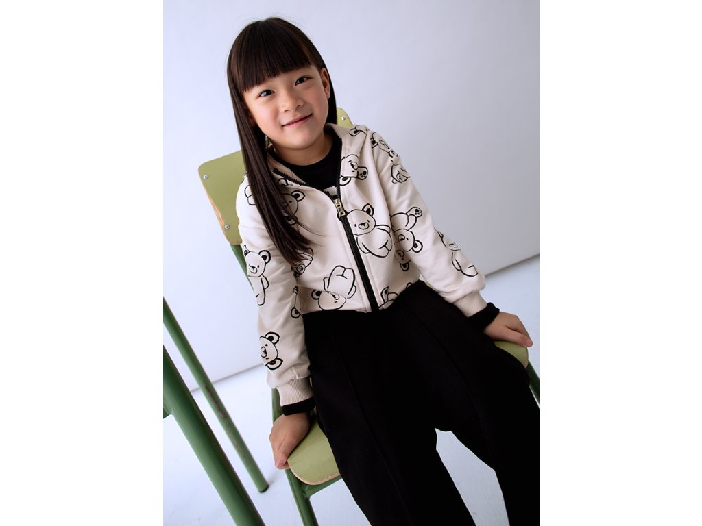Model vytvorený z ľahkého elastického úpletu, ktorý zaručuje úplnú voľnosť pohybu. Súprava obsahuje mikinu a dva páry nohavíc. Súprava je podšitá jemnučkým chlpkom.