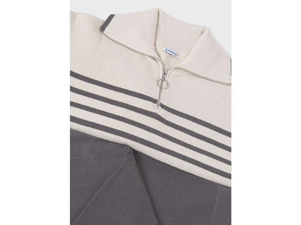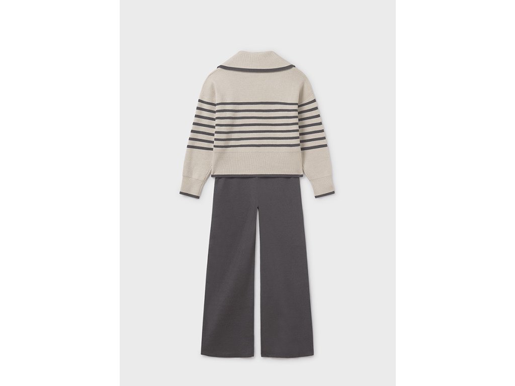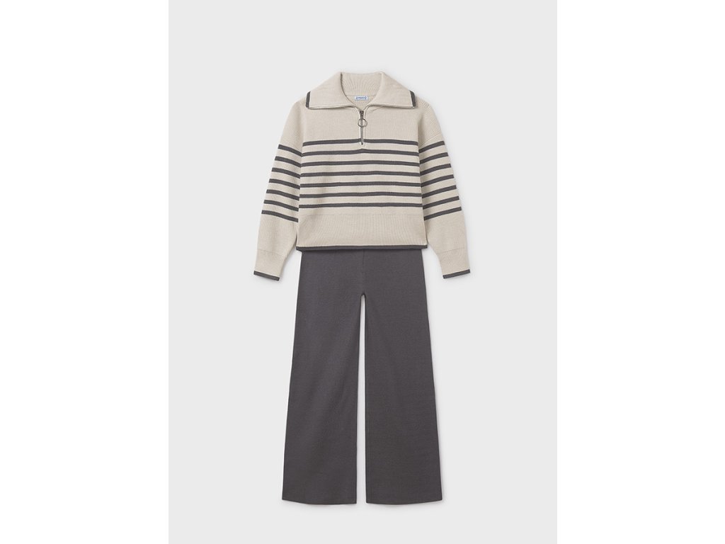 Model vytvorený z ľahkého elastického úpletu, ktorý zaručuje úplnú voľnosť pohybu. Súprava obsahuje sveter a nohavice.