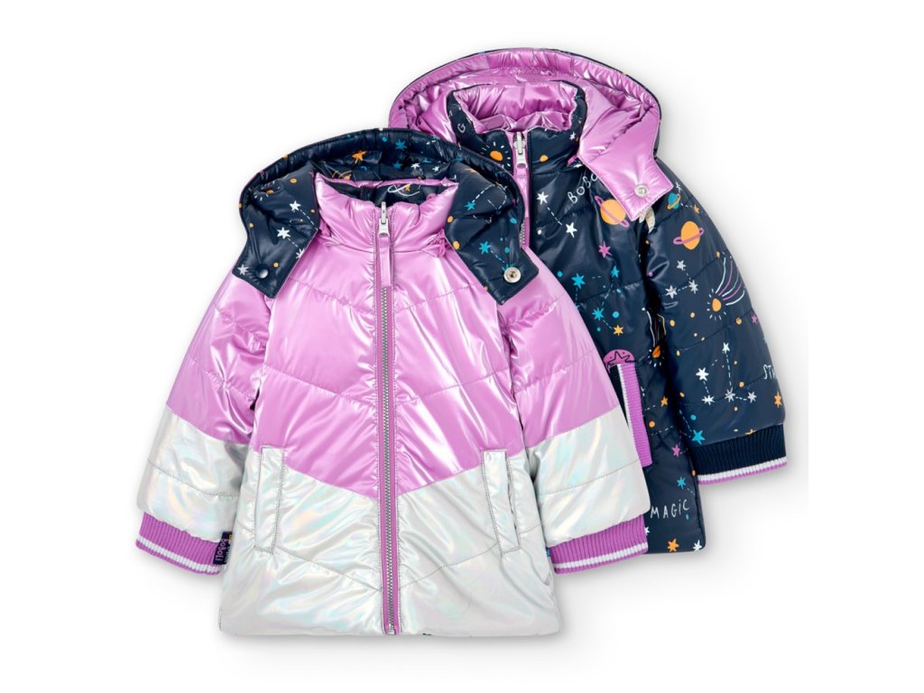 Dievčenská obojstranná zimná bunda s odopínacou kapucou.