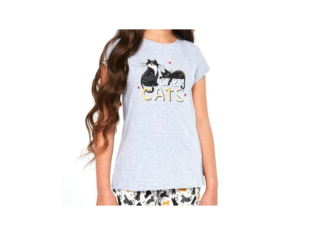 Obrázkové letné pyžamo s mačičkami na tričku aj kraťasoch v kvalitnom prevedení osvedčeného výrobcu Cornette.Dievčenské letné pyžamo CORNETTE je vyrobené z vysokokvalitnej bavlny.