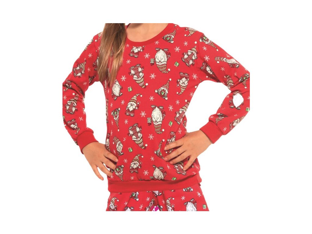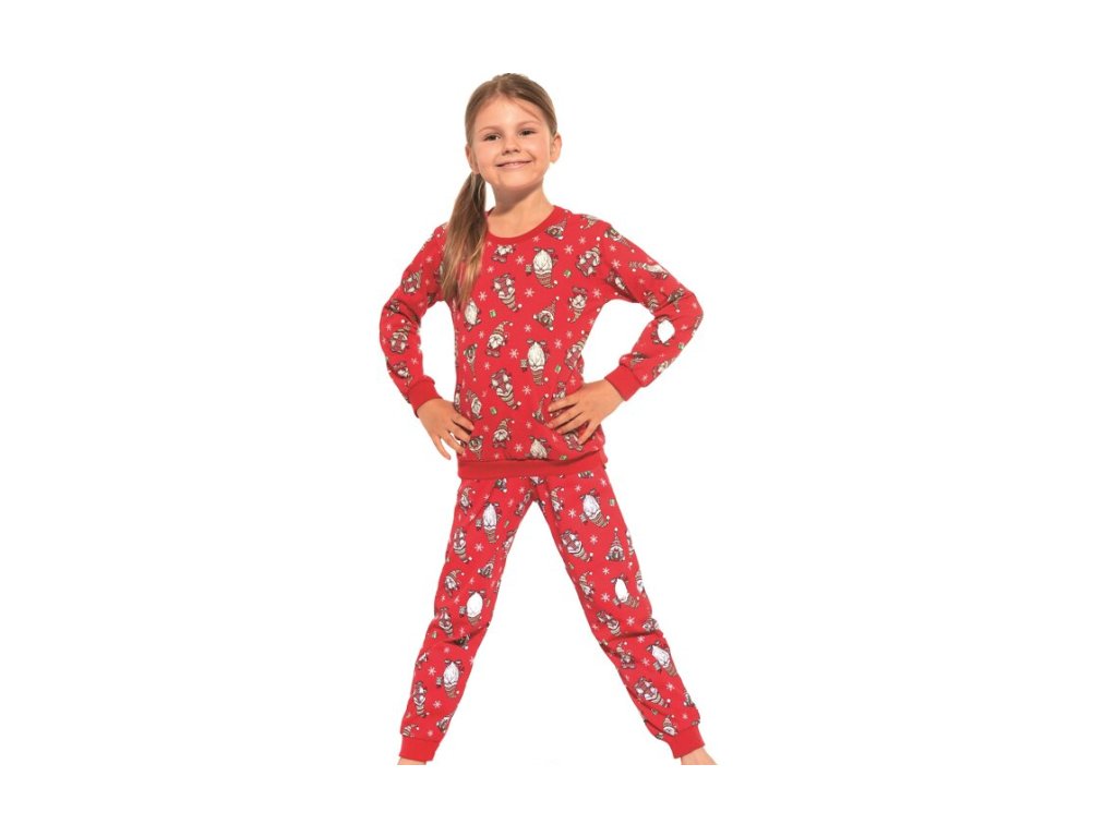 Dievčenské pyžamo do manžety. Krásne červené tričko s dlhým rukávom je celé posiate veselými obrázkami s vianočnou tématikou. Červené nohavice sú v rovnakom dizajne. V páse sú do neškrtiacej gumy a nohavice sú zakončené do manžety. Príjemný a mäkký materiál. Balené v peknej krabičke. Dievčenské pyžamo Cornette dlhý rukáv je vyrobené z vysokokvalitnej bavlny.