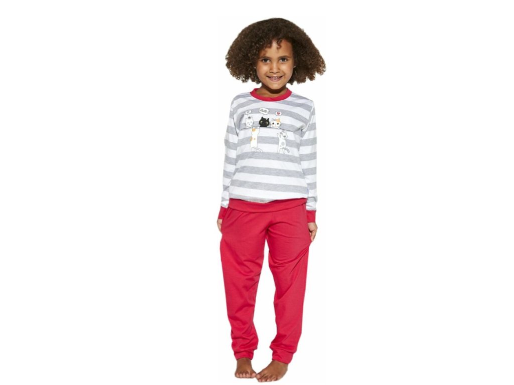 Pôvabné dievčenské pyžamo na spanie od módnej značky Cornette. Pyžamo s dlhým rukávom a dlhými nohavicami. Tričko je v pruhovanom štýle s roztomilým obrázkom s mačičkami na prednej strane. Okrúhly výstrih má manžetkou, ktorú sú ukončené ako dlhé rukávy a tak nohavice. Dlhé ružové nohavice sú v páse do pohodlnej gumy. Nádherné pyžamo poskytne hebkú náruč pre sladké sny vaším princeznám.