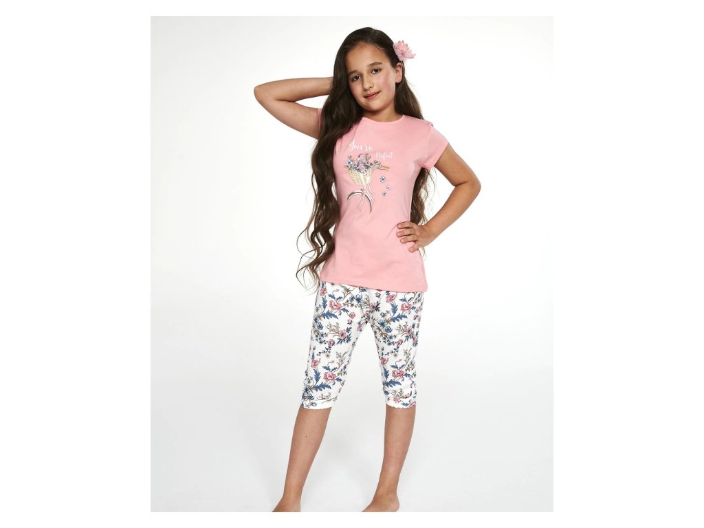Perfektné letné pyžamo pre dievčatá je vyrobené z vysoko kvalitných materiálov. Bavlnená blúzka je v jemnej ružovej farbe, zdobená košíkom s poľnými kvetmi. Súpravu dopĺňajú 3/4 kvetinové šortky s gumičkami. Šortky sú vyrobené z bavlny, vďaka čomu je materiál mimoriadne jemný k pokožke. Dievčenské pyžamo sa vyznačuje osvedčeným voľným strihom, ktorý poskytuje plné pohodlie počas spánku. Má certifikát bezpečnosti pre deti. Je balené v estetickej krabičke.