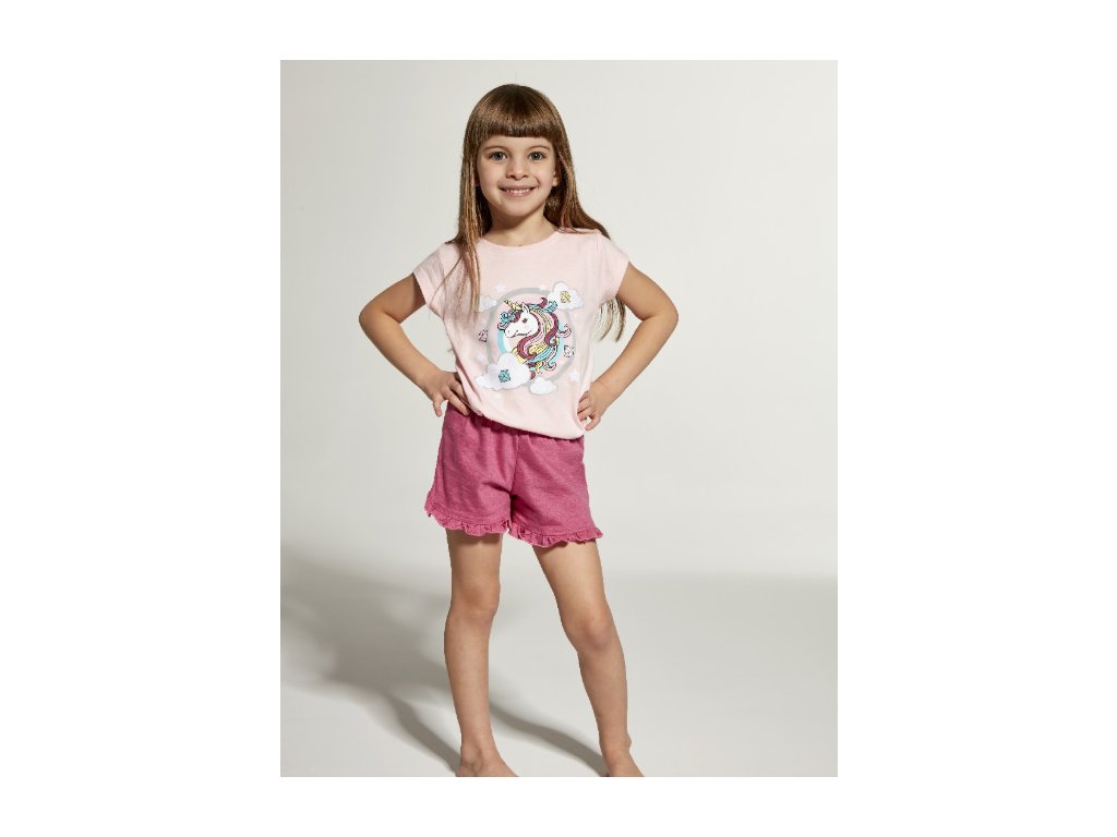 ápadité pyžamo s krátkym rukávom a kraťasy obľúbenej značky Cornette vzor 459/96 Unicorn s motívom jednorožca. Ružové tričko s obrázkom jednorožca a kraťasy s volánikom si vaše deti zamilujú. Pyžamové kraťasy sú v páse do širšej gumy, ktorá neškrtí. Perfektné spracovanie a kvalita. Balené v krásnej krabičke, vhodné ako darček.