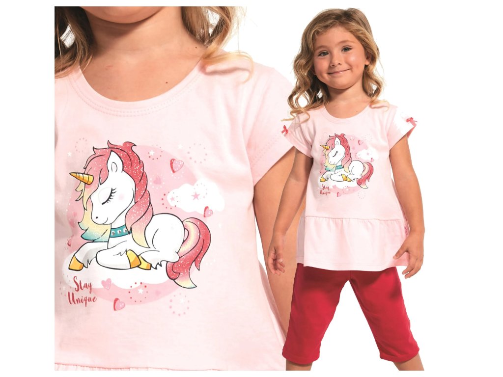 Dievčenské pyžamo vyrobené z vysoko kvalitného materiálu. Vrchná časť pyžama je svetloružovej farby. Okrúhly výstrih a pôvabná potlač jednorožca na hrudi. Doplňte ho malinovo sfarbenými pletenými capri nohavicami s pohodlným elastickým pásom. Pôvabný návrh, ktorý zaujme každú malú princeznú.