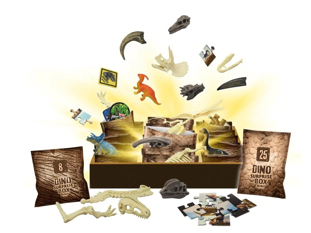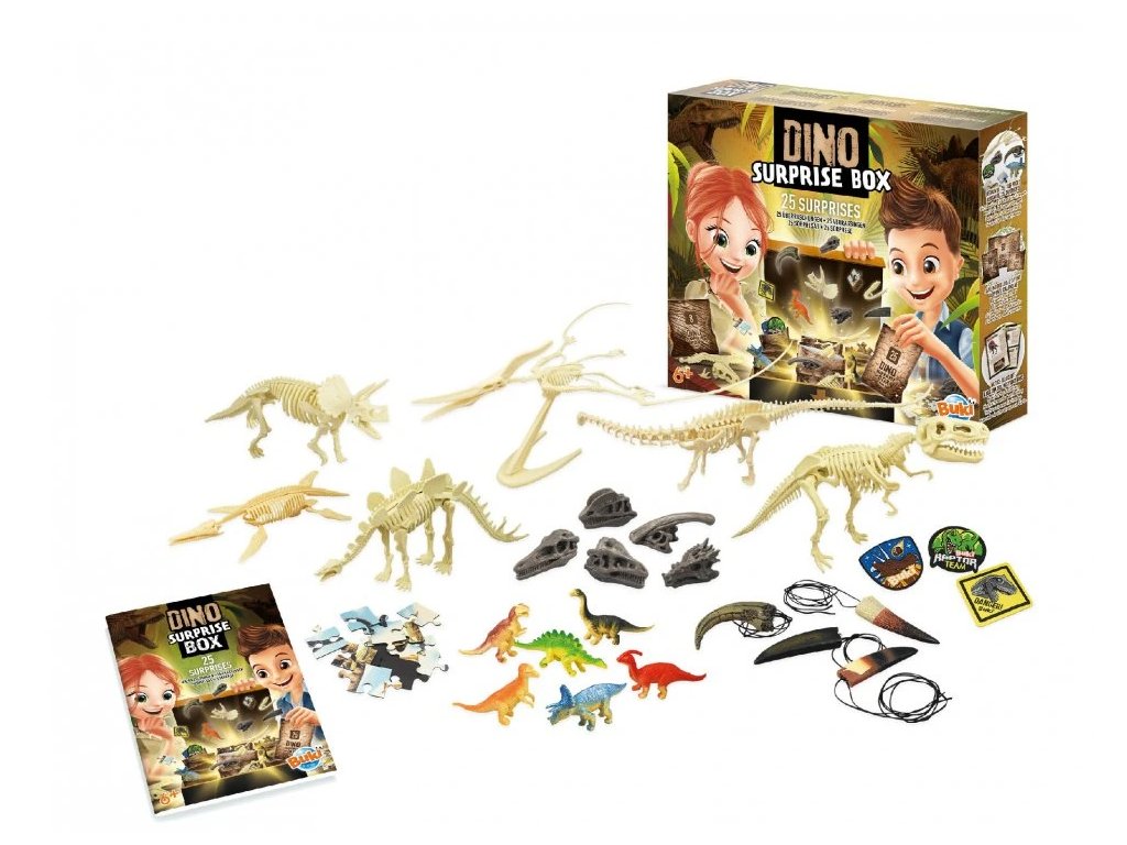 Táto súprava obsahuje 25 balíčkov s rôznymi darčekovými predmetmi s tématikou dinosaurov. Nájdete tam napríklad dinosaurí zub so špagátom na krk, puzzle kostier rôznych druhov dinosaurov, textilné nášivky, figúrky aj lebky dinosaurov, magnetky a ďalšie.