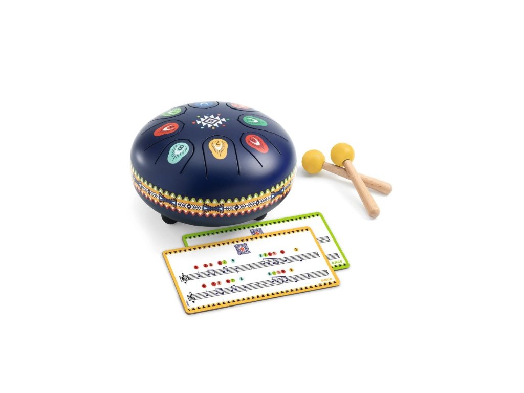Farebný kovový bubon od značky Djeco s 8 tónmi prináša deťom radosť z hudby a rytmu. Stačí udierať paličkami do jazykov a počúvať jemný, relaxačný zvuk. Ideálny pre prvé hudobné skúsenosti a rozvoj hudobného sluchu u detí od 5 rokov.