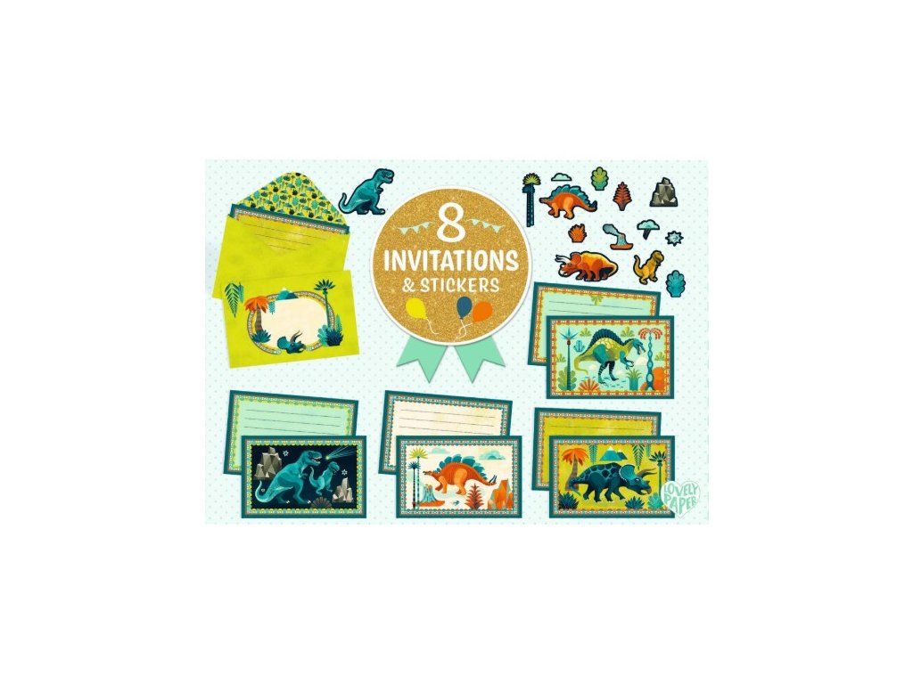 Dinosaury: 8 pozvánok a samolepiek je zábavná sada pre deti, ktorá obsahuje 8 farebných pozvánok, 8 ilustrovaných obálok a samolepky na ich ozdobenie. Sada je ideálna na narodeninové oslavy, tematické párty alebo na tvorivé aktivity. Dizajn má metalické detaily a matnú potlač.
