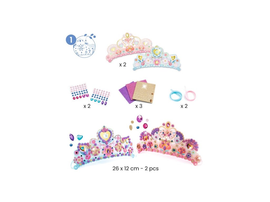 2 diadémy z tvrdého papiera, ktoré si deti ozdobia samolepiacimi diamantíkmi a trblietavými penovými samolepkami