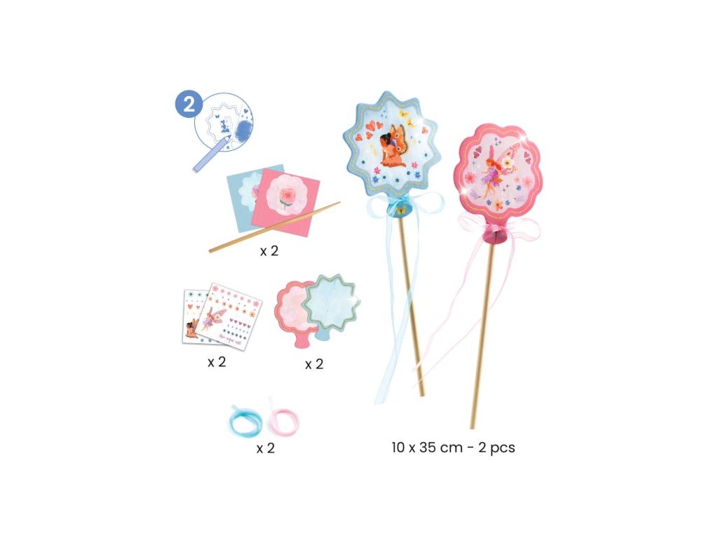 2 čarovné paličky, ktoré si deti poskladajú z kartónových ozdôb a drevených paličiek a dozdobia samolepkami a stužkami