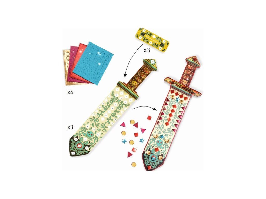 S touto kreatívnou sadou sa každý malý pirát môže stať majiteľom troch jedinečných mečov – dvoch rovnakých a jedného zakriveného. Meče sú vyrobené z pevného kartónu, predkreslené a ilustrované, s bielymi plôškami, ktoré čakajú na samolepiace mozaikové dieliky. Týmto spôsobom si každý meč deti ozdobia podľa vlastnej fantázie a vytvoria z neho skutočný poklad pirátskeho kapitána.