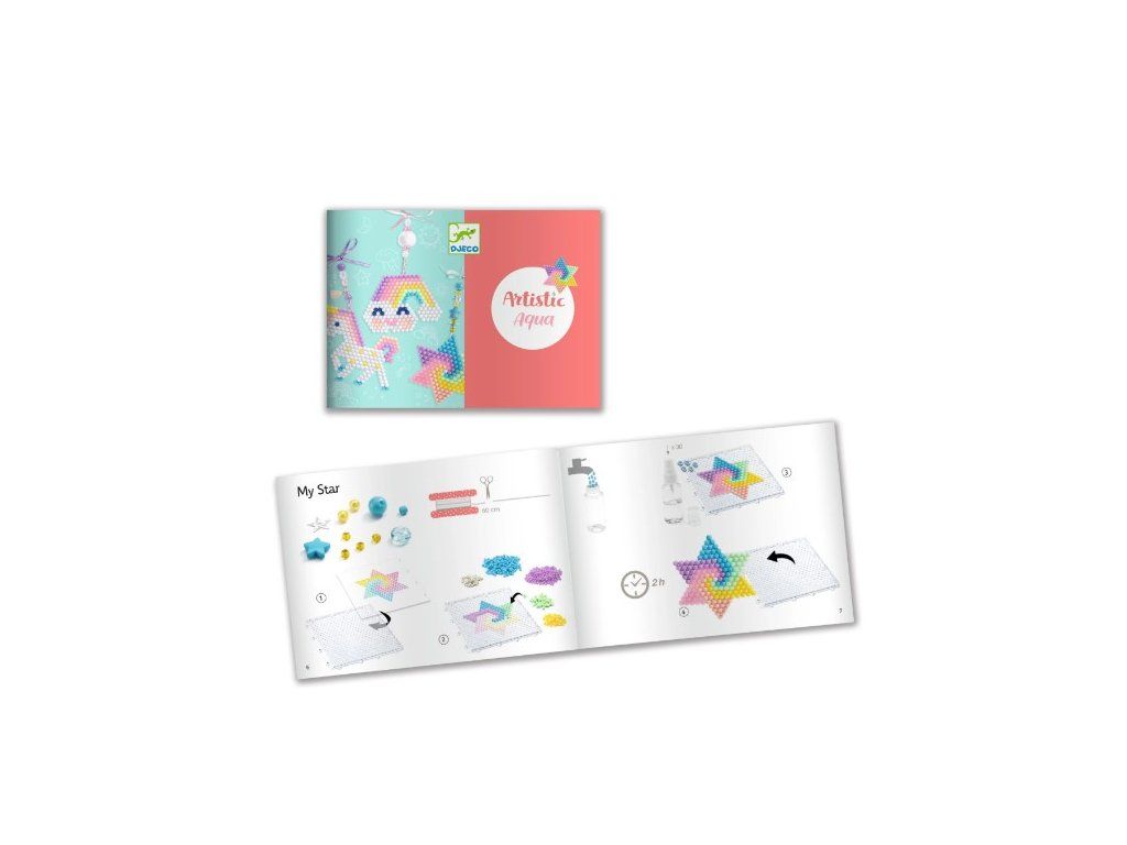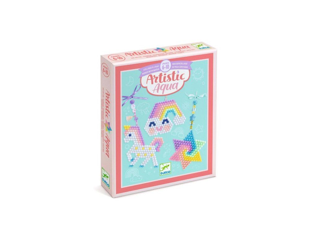 Kreatívna sada Djeco Artistic Aqua je skvelý úvod do tvorivého korálkovania pre deti. Deti si samy poskladajú 3 originálne prívesky z farebných pastelových korálok na špeciálnej podložke podľa predlôh – napríklad motív dúhy, jednorožca či hviezdy – a pomocou vody ich zlepia do pevnej mozaiky. Výsledné prívesky môžu deti nosiť ako ozdoby alebo darovať ako originálne handmade darčeky. Všetko je doplnené obrázkovým návodom krok za krokom, takže aj mladší tvorcovia môžu úspešne zvládnuť celý projekt.