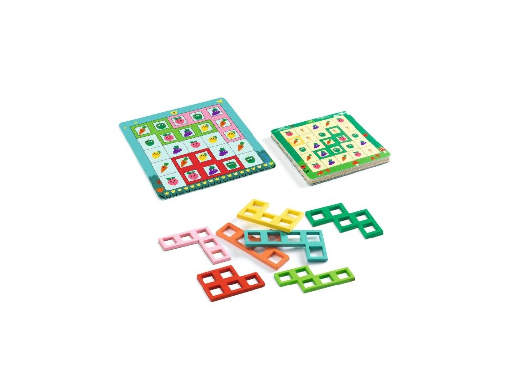 Vitaj v logickej záhradke plnej chutného ovocia a zeleniny! Na prvý pohľad to vyzerá jednoducho – plody stačí rozdeliť do záhonov. Má to však jeden háčik: v každom záhone môže byť iba jeden druh ovocia alebo zeleniny, a navyše musíš dodržať presné tvary záhonov, ktoré určuje zadanie. Hra Logická záhrada obsahuje 40 ilustrovaných úloh rôznych úrovní náročnosti. Každá úloha predstavuje inú výzvu pre malých záhradníkov a logikov. Úlohou dieťaťa je vybrať zo 7 drevených dielikov práve tých 5, ktoré presne zapadnú do mriežky a vytvoria správne oddelené záhony – bez presahovania a bez miešania plodov.