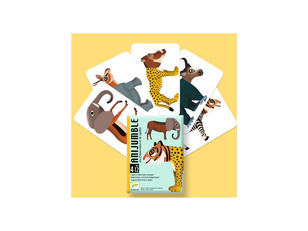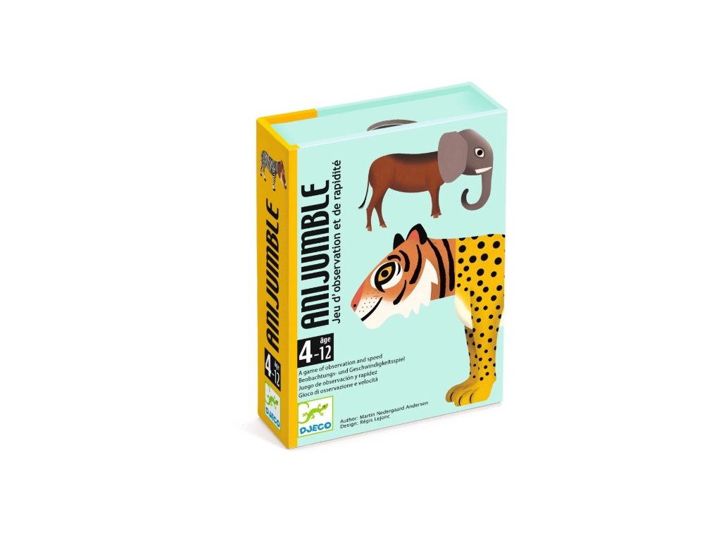 Anijumble od značky Djeco je dynamická kartová hra zameraná na rýchlosť, postreh a pozornosť. Úlohou hráčov je čo najrýchlejšie rozpoznať správne zviera z poprehadzovaných častí obrázkov na kartách. Hra ponúka krátke, svižné herné kolá plné napätia a smiechu a je vhodná na hranie doma aj na cestách.