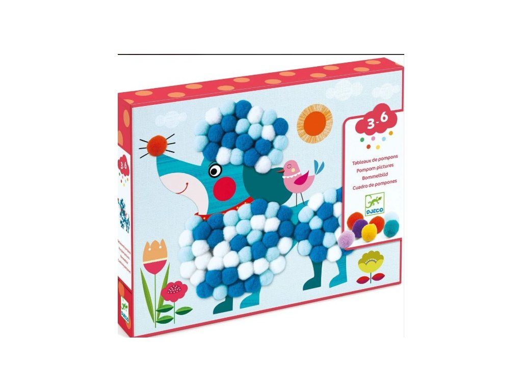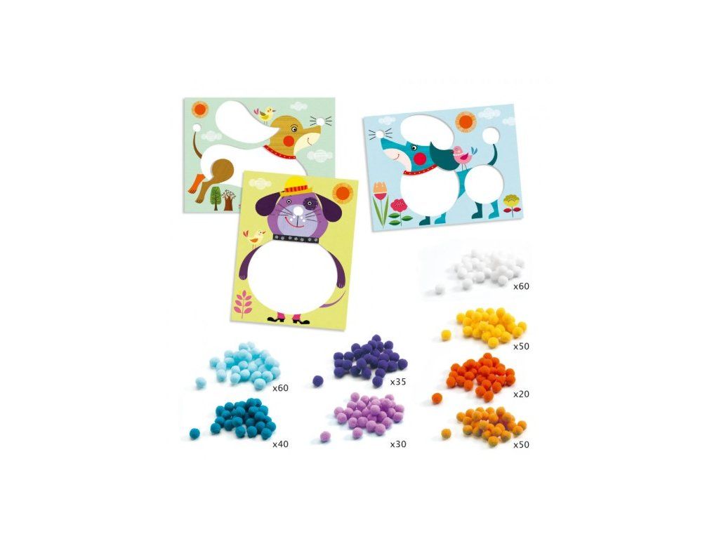 Koláž z brmbolcov Psíky je tvorivá sada, v ktorej deti dotvárajú tri roztomilé psíky pomocou mäkučkých farebných brmbolcov. Na obrázkoch sú pripravené lepivé plôšky – stačí priložiť brmbolec, pritlačiť a sledovať, ako sa ilustrácia postupne mení na taktický „chlpatý“ obrázok.