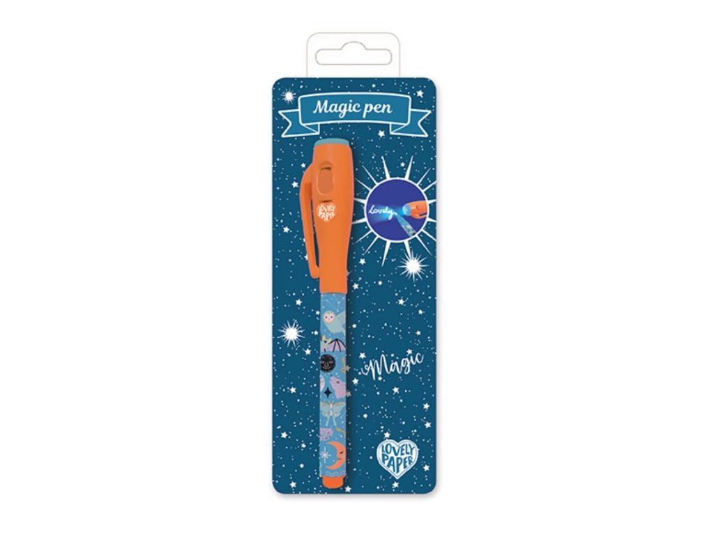 Zápisky sa ukážu až pod UV svetlom. Zdroj UV svetla, tlačidlo na zapnutie/vypnutie svetla a 3 batérie typu LR44 sú priamo vo vrchnáku pera. Vrchnák má praktický klips na pripnutie pera na zošit. Pero má fixkový hrot. Farebné telo pera zdobia krásne ilustrácie. Batérie sú súčasťou balenia. Rozmery: 0,5 x 13 cm.