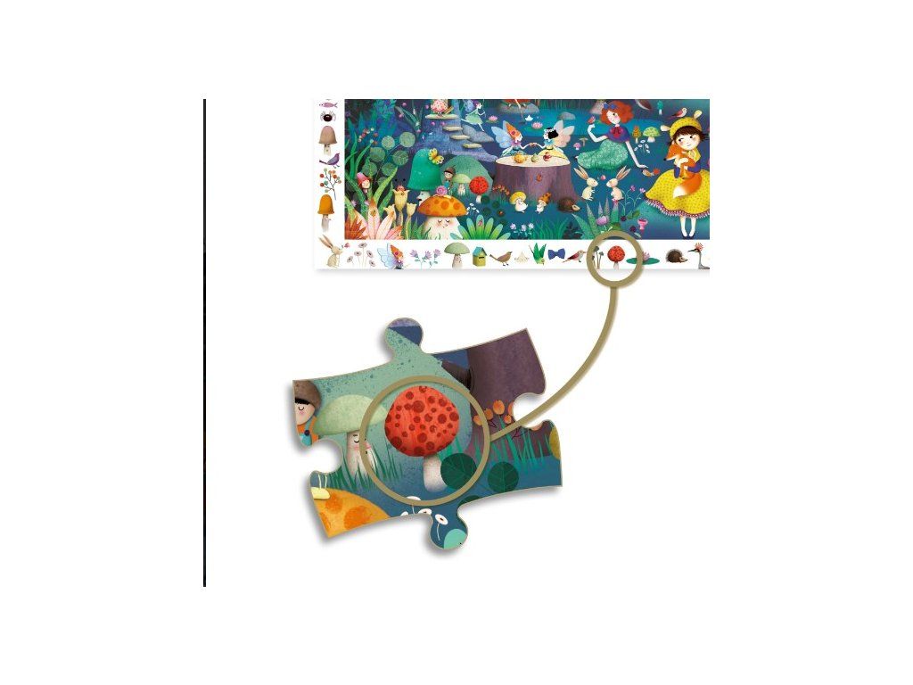 Objavovacie puzzle Rozprávkový les spája skladanie puzzle so zábavnou postrehovou hrou.Deti poskladajú 100 dielikov do veľkého obrázka 61 × 38 cm a potom pokračujú v hre: v rámčeku okolo puzzle sú nakreslené drobnosti a úlohou je nájsť ich v hotovej scéne.Rozprávkový svet plný zvieratiek, víl a malých obyvateľov lesa motivuje pozerať sa pozorne, počítať, pomenúvať a vymýšľať príbehy.