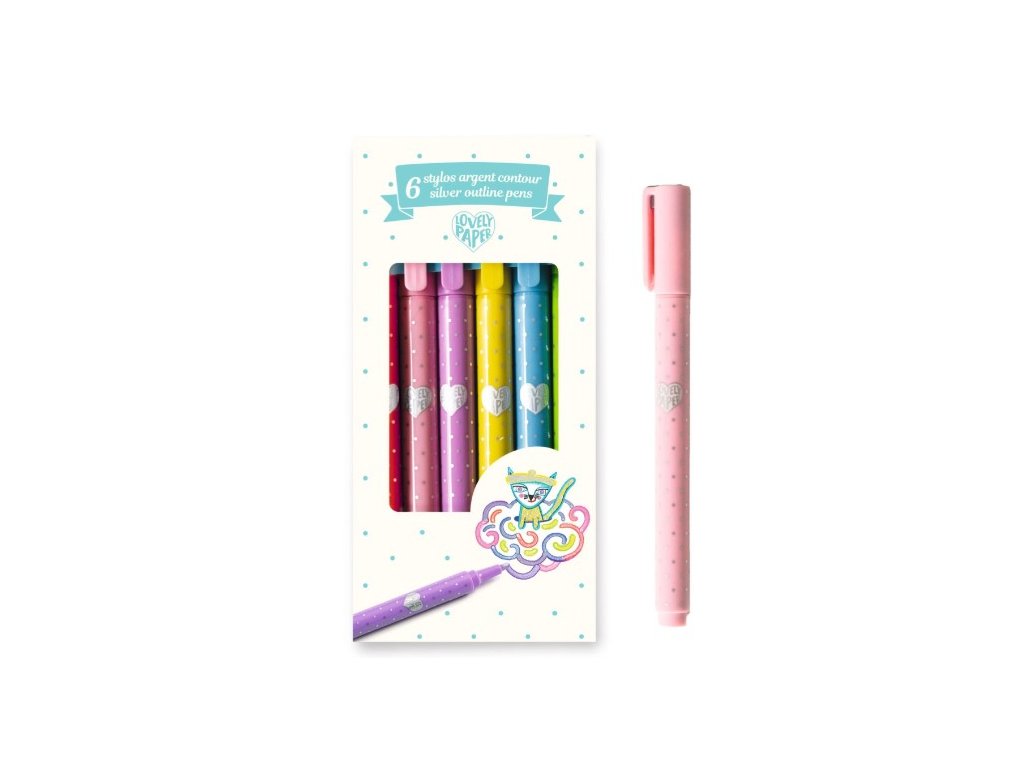 Objavte sadu 6 obrysových pier so strieborným leskom z kolekcie Lovely Paper od značky Djeco. Sada obsahuje perá v šiestich žiarivých farbách: červená, žltá, zelená, modrá, ružová a fialová. Každé pero má praktický vrchnák s klipsom, takže ho môžete ľahko pripnúť na zošit, blok či kresliaci papier.