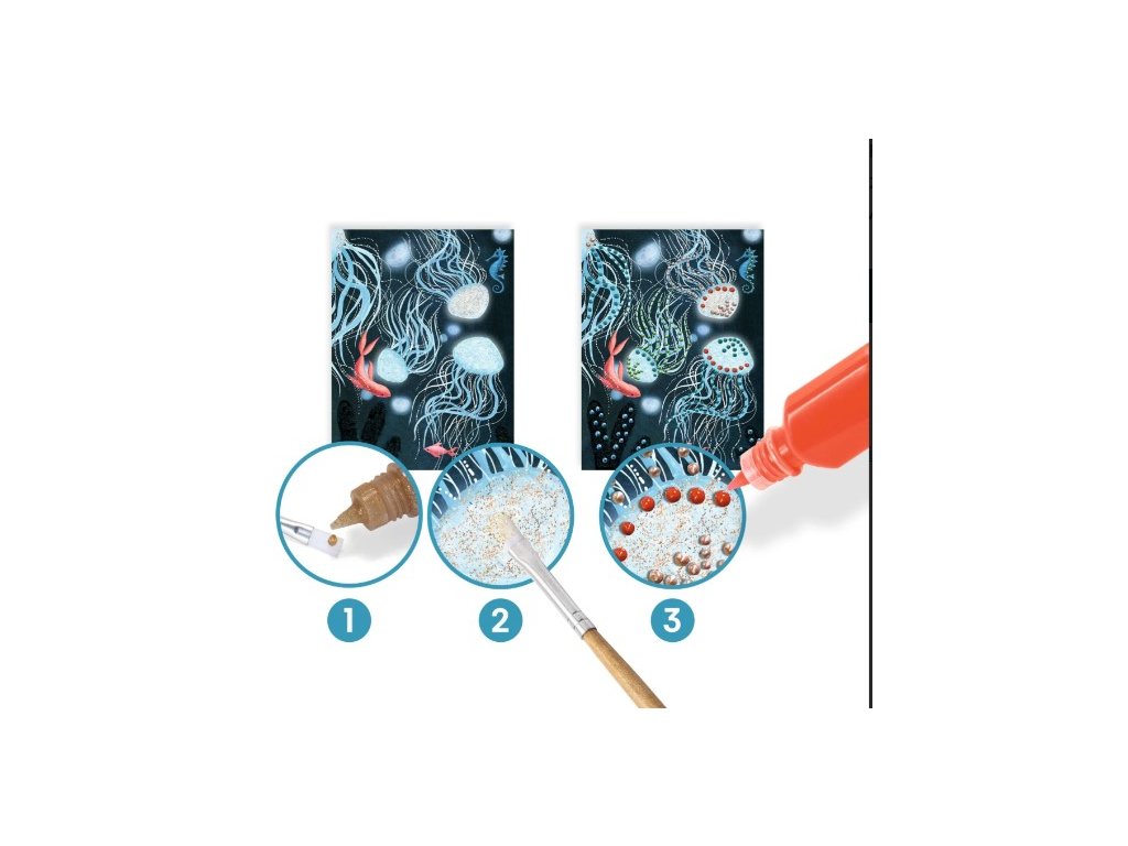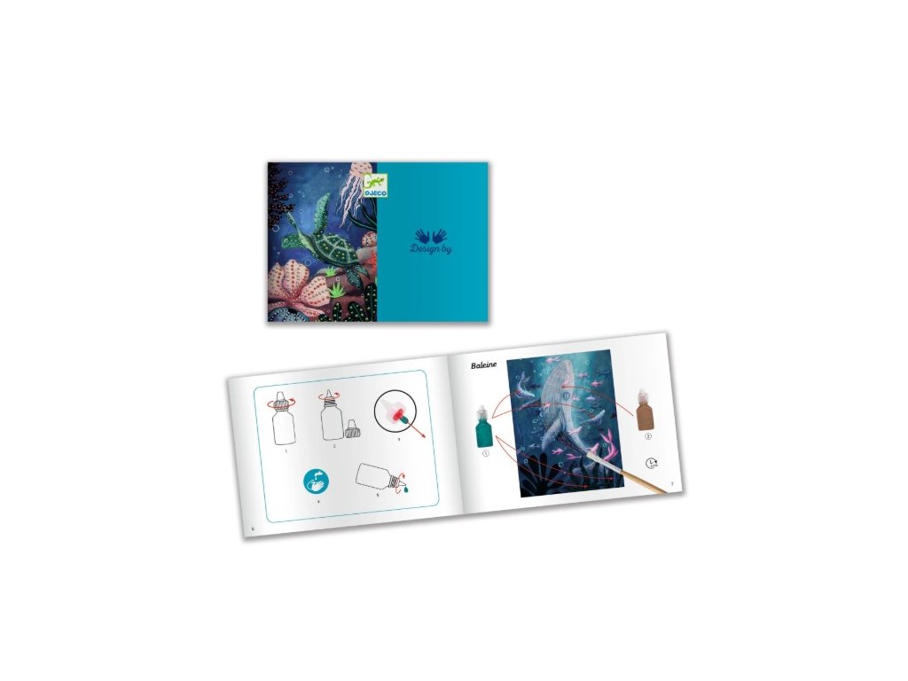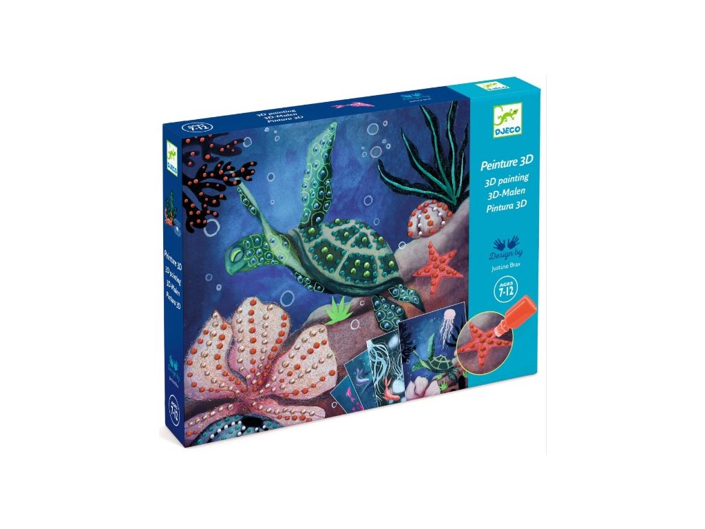 Kreatívna sada Pod morskou hladinou: 3D maľovanie od Djeco ponúka deťom zábavnú výtvarnú aktivitu, pri ktorej maľujú 3D obrazy s morskými zvieratkami pomocou farebných perleťových, trblietavých a matných farieb. Sada obsahuje 4 ilustrované dosky, 8 farieb a štetec, takže deti môžu tvoriť vyvýšené čiary a bodky pre efektné reliéfne maľby. Tento umelecký set rozvíja kreativitu, jemnú motoriku a farebné cítenie, pričom je vhodný pre deti od 7 rokov. Po dokončení dielka môžu deti uložiť materiály do úložného boxu a obdivovať svoje 3D diela.