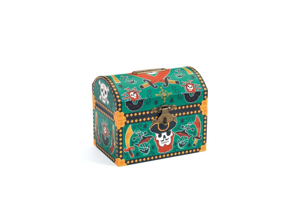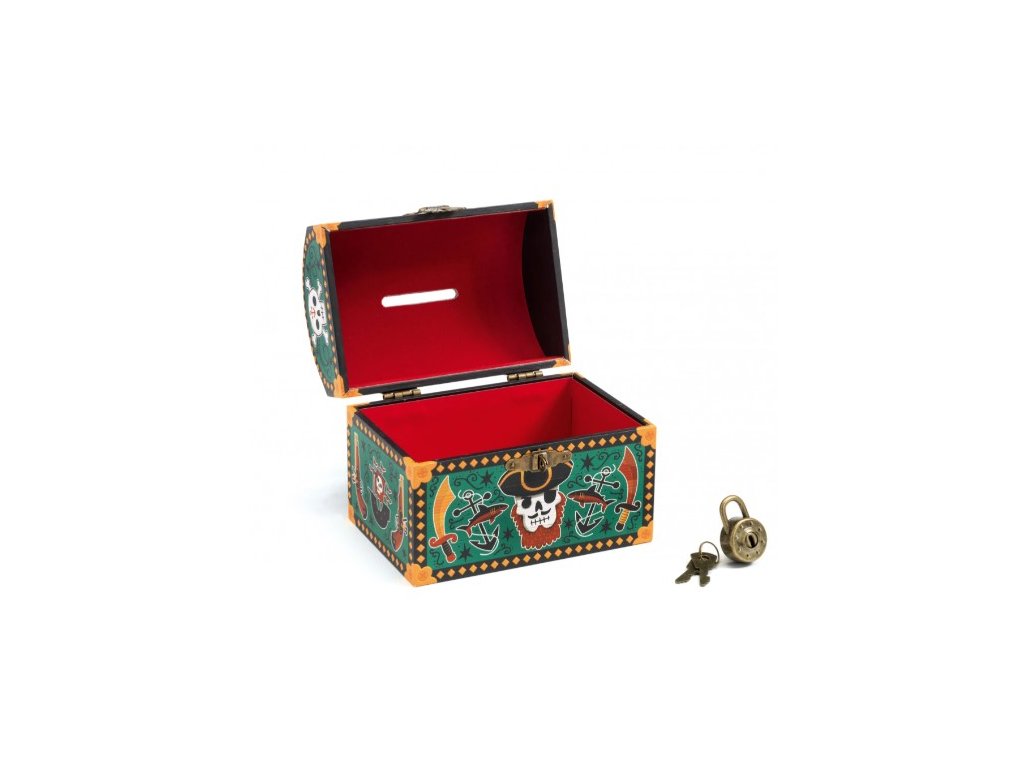 Skvelá drevená pokladnička v tvare truhličky, s ilustráciami pirátskych motívov. Na otvore vo veku má pozdĺžny otvor s kovovou obrubou na vkladanie úspor.