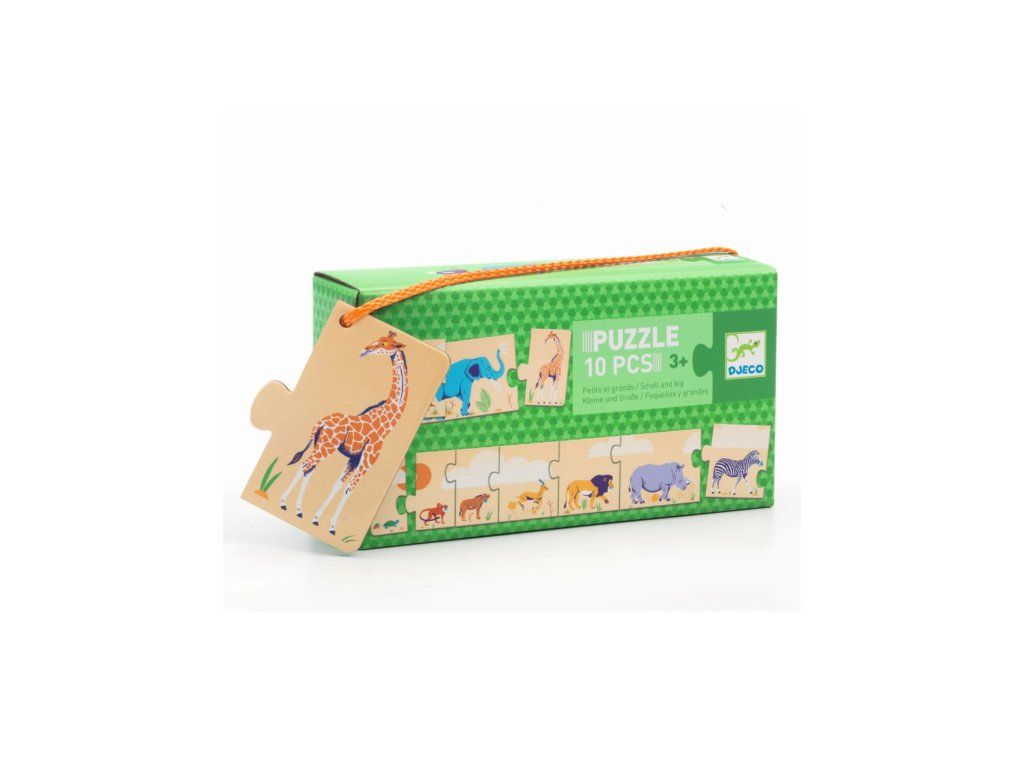 Postupové puzzle malý – väčší – najväčší s motívom afrických zvierat sú ideálne prvé puzzle pre malé deti. Dieťa skladá zvieratká od najmenšieho po najväčšie, čím sa prirodzene učí porovnávať veľkosti a vnímať postupnosť. Puzzle pozostávajú z 10 pevných dielikov, ktoré sú prispôsobené malým detským rukám. Jednoduchý princíp skladania podporuje samostatnú hru a prináša deťom radosť z úspechu.