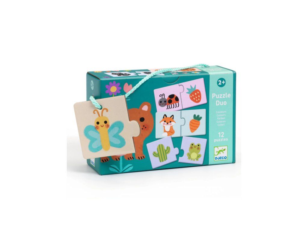 Puzzle Duo Farby je edukačné párovacie puzzle značky Djeco, ktoré pomáha deťom prirodzene spoznávať farby. Dieťa vždy spojí 2 dieliky tak, aby k sebe patrili nielen tvarom, ale najmä rovnakou farbou – napríklad zvieratko a predmet v rovnakom odtieni.