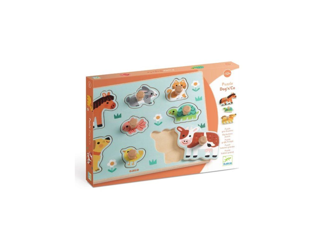 Puzzle Farmárske zvieratká – Dog'n'Co je ideálnou prvou skladačkou pre malé deti. Veselé ilustrácie domácich zvieratiek a veľké drevené dieliky s úchytkami sú prispôsobené malým detským rúčkam. Deti sa pri hre zoznamujú so zvieratkami z farmy, učia sa vkladať dieliky na správne miesto a zároveň si prirodzene rozvíjajú motorické zručnosti.