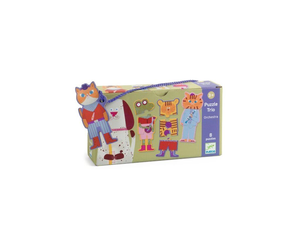 Puzzle Trio Orchester je edukačné puzzle značky Djeco, v ktorom deti skladajú zvieratká – hudobníkov z 3 dielikov. Každá postavička sa skladá zvisle (hlava–telo–nohy), takže dieťa prirodzene chápe, čo kam patrí, a pritom si trénuje pozornosť aj presnosť.