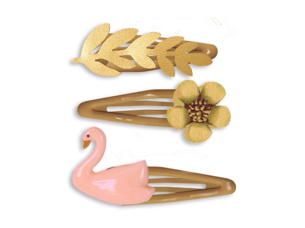 Jemný detail do účesu: 3 sponky s lístkom, kvietkom a labuťou, ktoré držia šetrne a bez ťahania